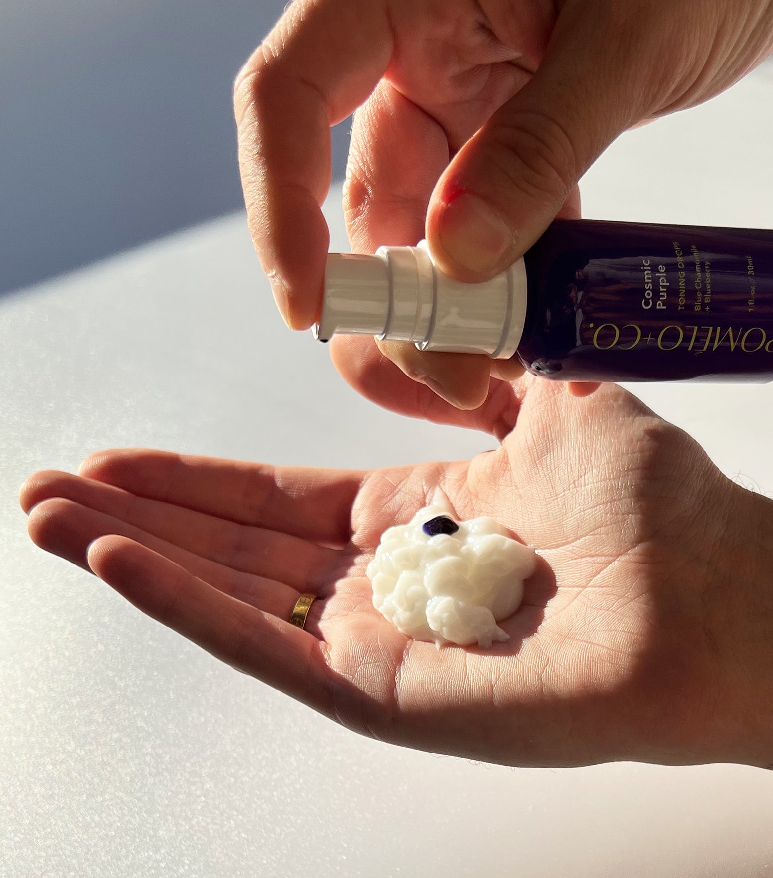 1. Add 1-2 pumps* to a portion of shampoo or conditioner (+/- 10 g) in the palm of your hand, mix and apply as usual.